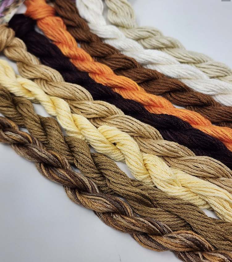 Contains nine skeins of silk 10 yards each of the following colors: Espresso, Biscotti, Shortbread, Little Fox, Cacao, Java Hut, Caramel, Cold Foam...